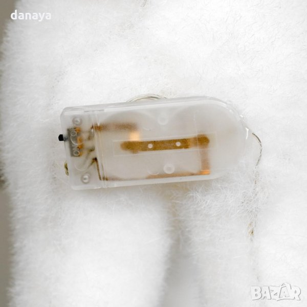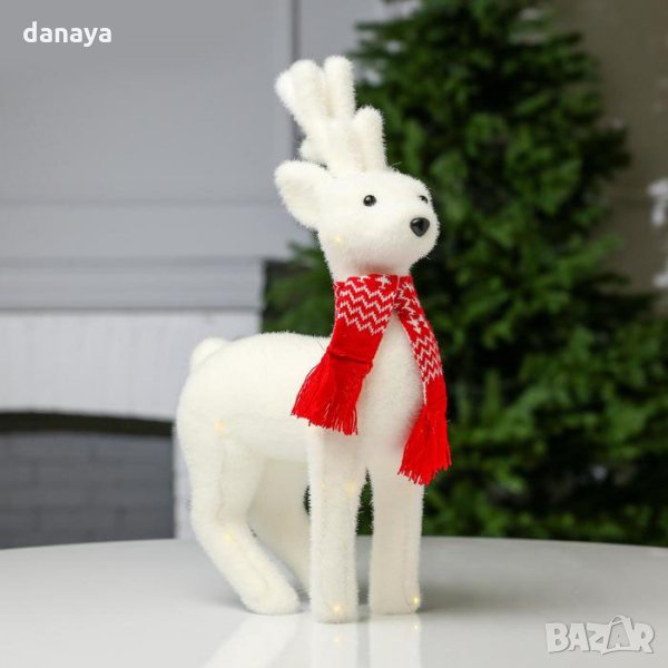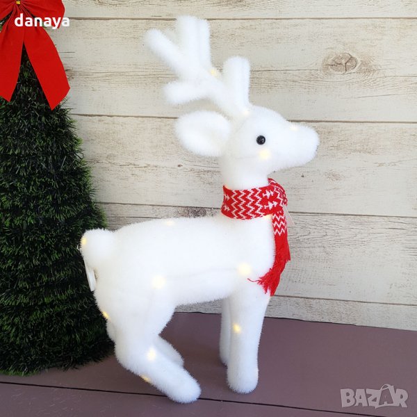 Декоративна коледна фигура снежно бял елен с 24 лед светлини. Прекрасен декор за коледните празници. Където и да го поставите ще донесе много коледно настроение, топлина и уют в дома. Еленът има червено плетено шалче и свети с меки светлинки.