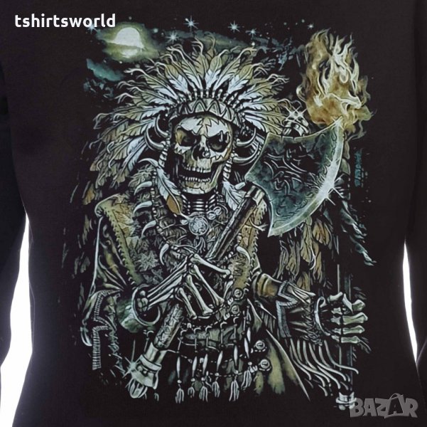 Нов детски суичър в черен цвят с качулка и дигитален печат Скелет с брадва. Произведен в България от висококачествен 100% памук - триконечна пенирана вата с кардировка, което го прави изключително топъл и желан от нашите дългогодишни клиенти. Моделът е подходящ за пролетния и есенно-зимният сезон, има ластични маншети на китките и ханша, запазващи топлината. Разполага с мека подплата,а свободната кройка го прави под
