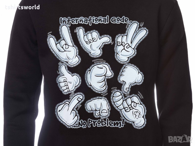 Нов детски суичър в черен цвят с качулка и трансферен печат International code.. no problem. Произведен в България от висококачествен 100% памук - триконечна пенирана вата с кардировка, което го прави изключително топъл и желан от нашите дългогодишни клиенти. Моделът е подходящ за пролетния и есенно-зимният сезон, има ластични маншети на китките и ханша, запазващи топлината. Разполага с мека подплата, а свободната кройка го прави подходящ както за спорт, така и за ежедневно носене с дънкови панталони. Марката PRINTEX от години се слави със своите топли и качествени суичъри.