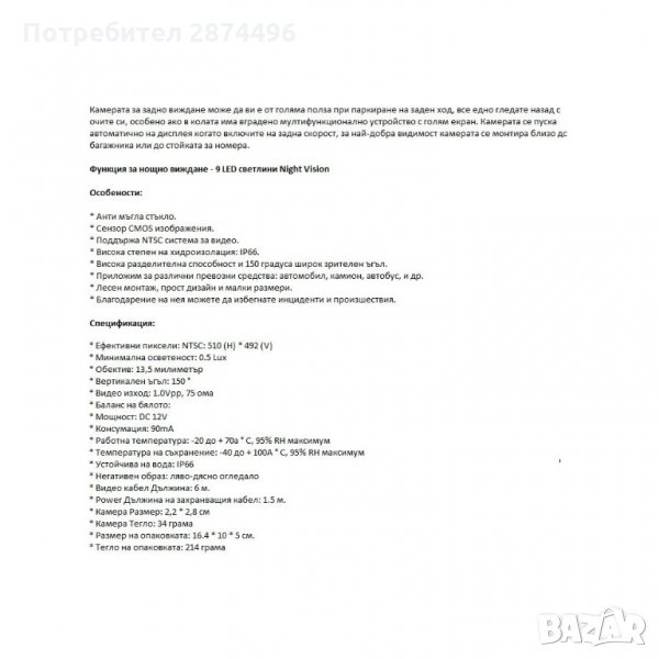 С тази камера можете да видите какво се случва зад автомобила, което е много полезно при паркиране и за избягване на инциденти. Тази камера за задно виждане е идеална за всички превозни средства и ще направи шофирането и паркирането по-безопасно и по-удобно.