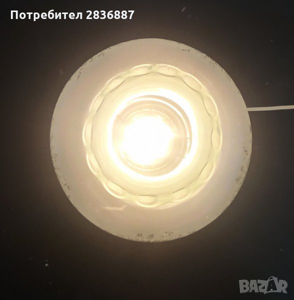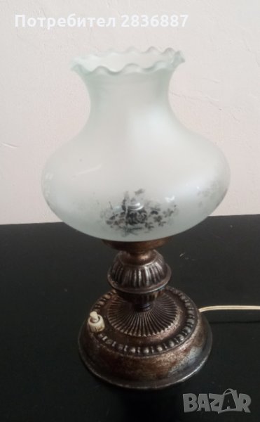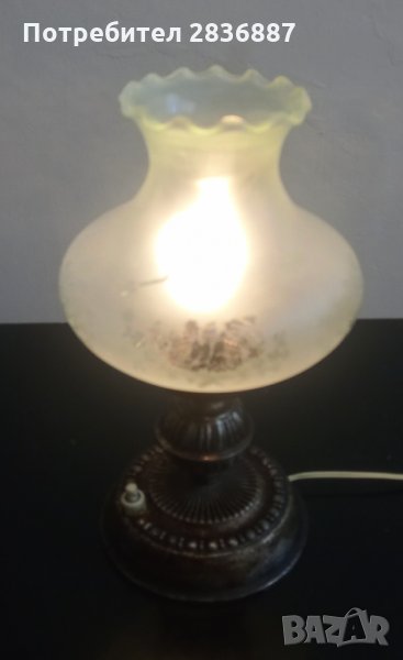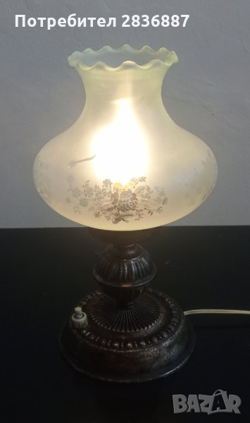 Основата на лампата е метална, плафона е от матово стъкло. Работи безупречно и е от 50-60 те години на миналия век. Висока е 26 см и без забележки.