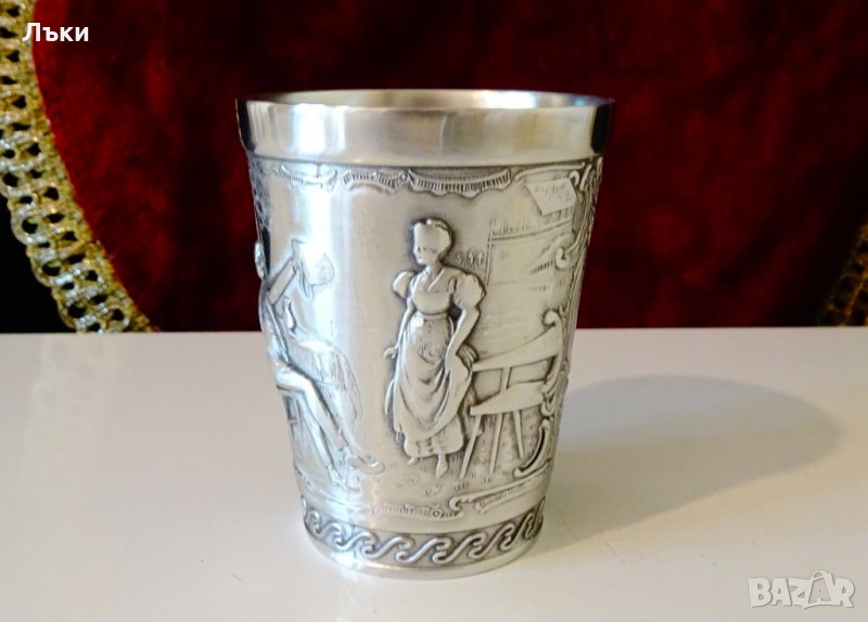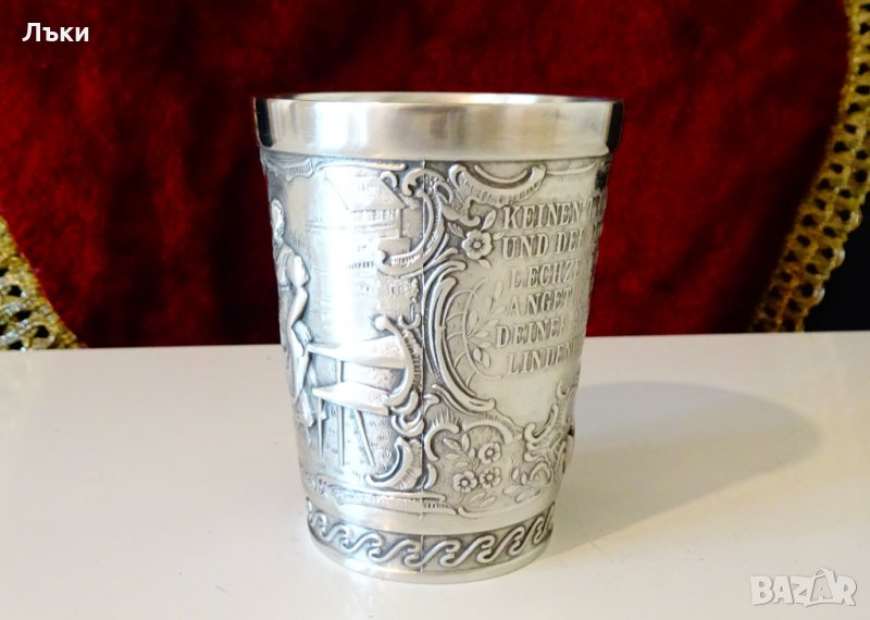 Старинна немска чаша за вино,ръчно изработена от 95% калай и 5% сребро,маркирана.Чашата има релефна картина по любимата студентска и народна песен "Die Lindenwirtin" – „Нито една капка в чашата”,написана през 1877 година от Рудолф Баумбах. Песента е посветена на емблематична кръчма „Gasthof zum Godesberg” в Бад Годесберг с красивата 18 годишна домакиня - Ännchen Schumacher.За какво се разказва е описано с релефно гравиран текст: