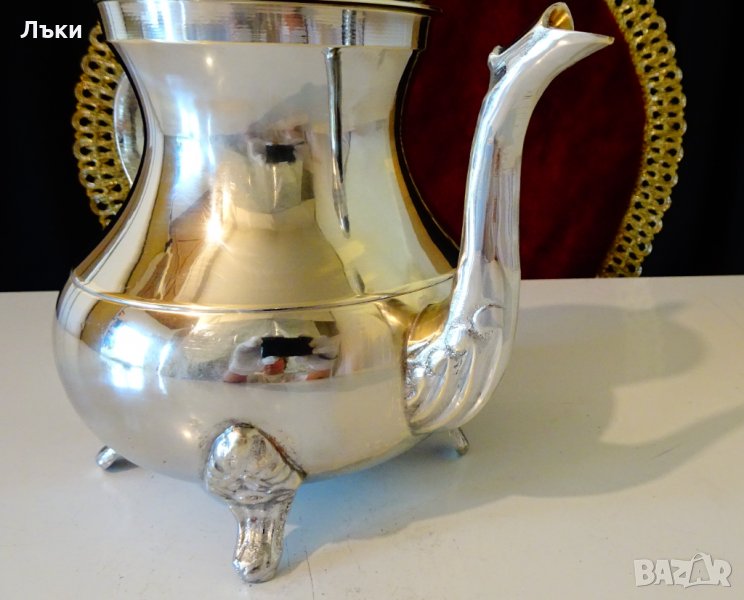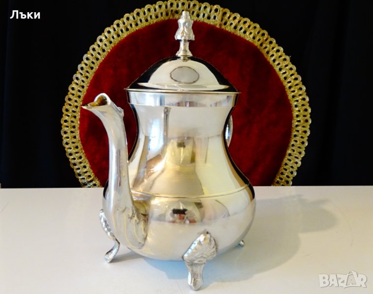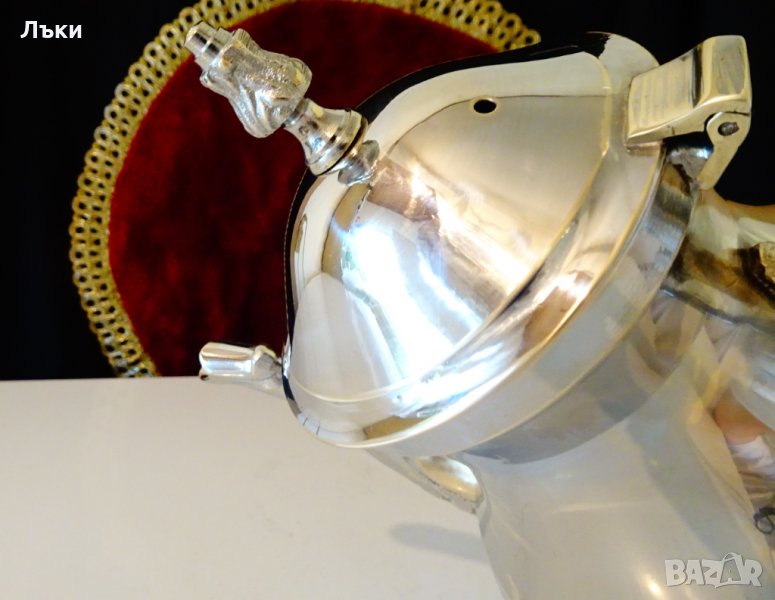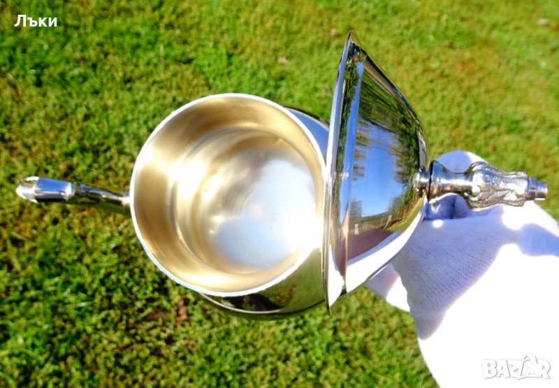 масивен високо качествен бронз,маркирана.Дебело посребрена с висока проба сребро,родирана за трайност и блясък.Декорирана с релефни барокови орнаменти.Има четири стабилни релефни крачета.Безупречна,ослепително блестяща кана,която мисля,че не е ползвана.Височина 19 см.,диаметър 12 см.,тегло 660