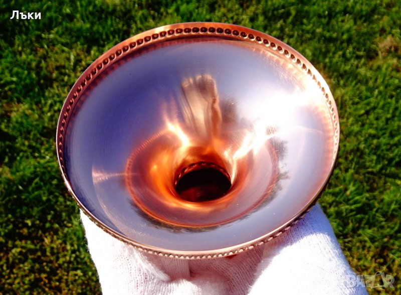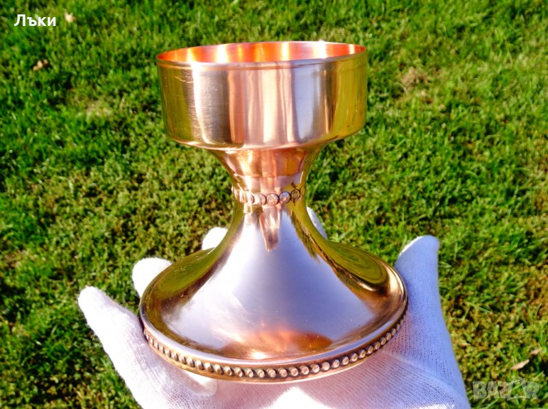 етикет.Изработен от високо качествена блестяща чиста червена мед.Височина 10.5 см.,диаметър на чашката 7 см.,диаметър на основата 10.5 см.Тегло 160 гр.