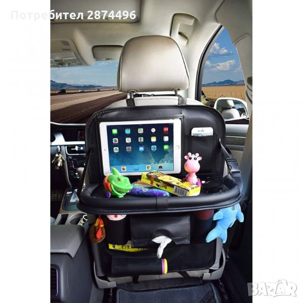 Този органайзер за седалка има отделение, което се отваря и става малка масичка,за да поставите таблета, напитките или храната. Също така разполага и със второ сгъваемо отделение, което се превръща в кошче за малки отпадъци като опаковките на сандвичите или празните бутилки и кенчета.