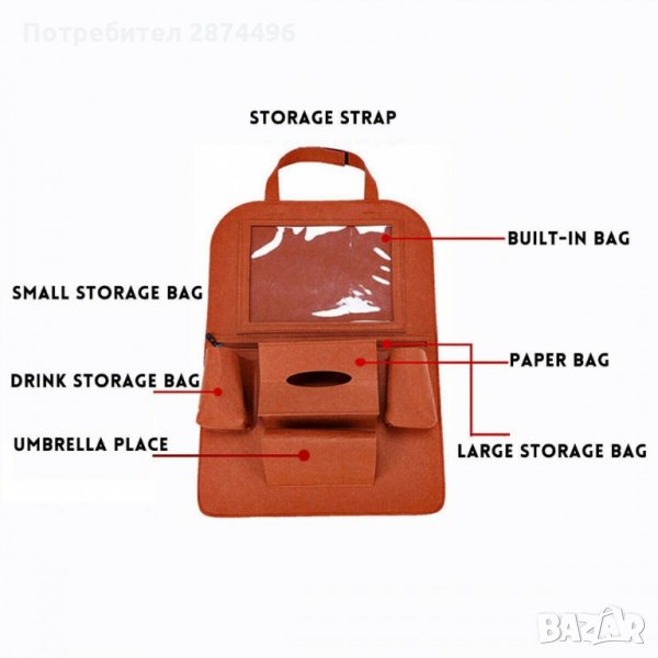 Органайзерът има още 4 малки джоба за бутилки, мобилен телефон, ключове, кърпички или други неща и 1 по-голям джоб за книги, списания, играчки и т.н.