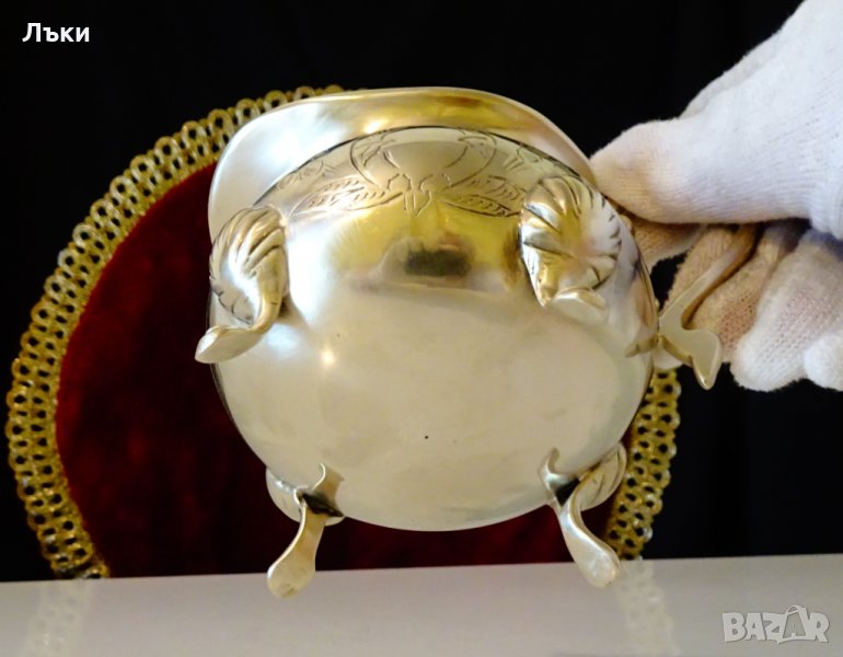 от масивен златен бронз. Декорирана с красиви релефно гравирани барокови орнаменти.Има 4 стабилни релефни крачета.Аристократична осанка и безупречно