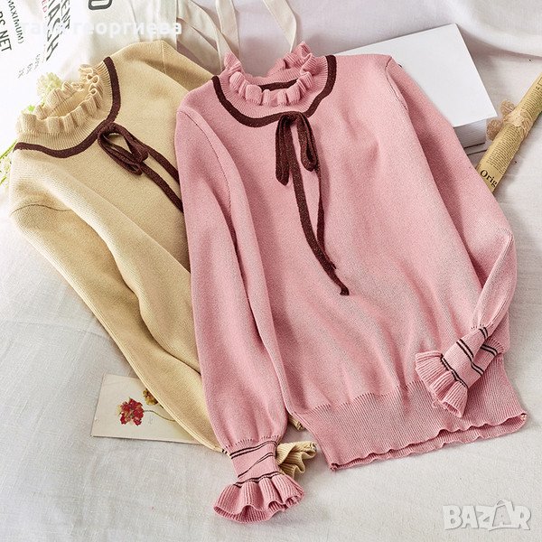Уникалeна нов луксозен плетен бежов пуловер-тип блузка с блестящ елемент около врата и ръкавите и кокетни връзки на яката