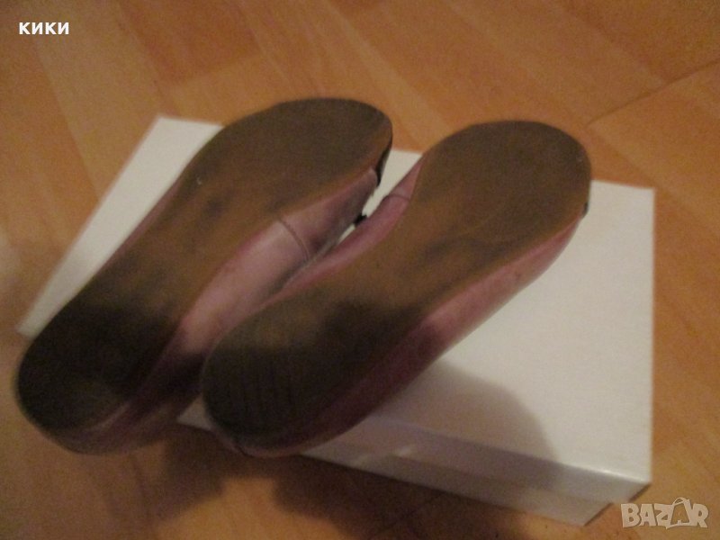 Като нови . № 35 Стелка 22,5 см Отговарят си точно Естествена качествена гладка кожа. Омекотена стелка също от естествена кожа Цвят пепел от рози с много тъмно лилаво-бордо. Много меки и удобни . Подметка еластична извива се по крака