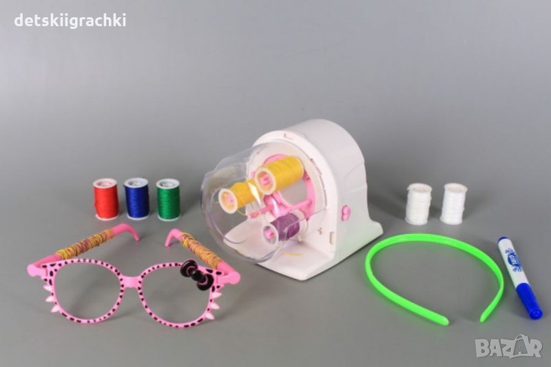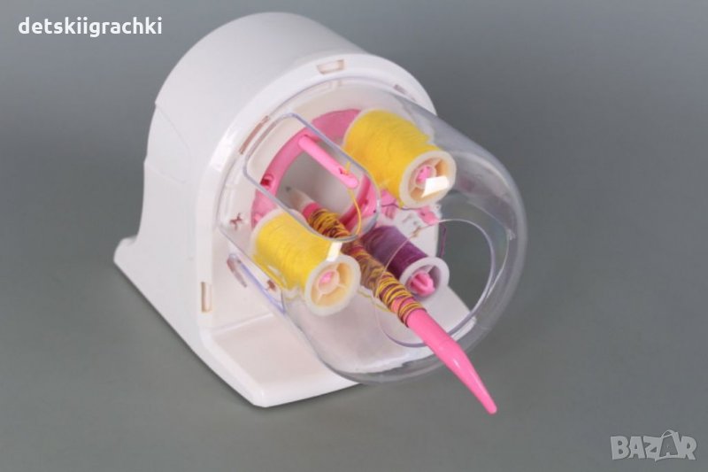 Комплектът съдържа машинка, бели и цветни конци, аксесоари, на които се навиват конци и инструкции.Функции: навиване на конци около различни аксесоари (например рамка на очила, каишка на часовник) или кичури коса; оцветяване на бели конци (за целта се използват съответните приставки и маркер включени в комплекта). Играчката развива креативността и творческата мисъл у децата! Размери на машината-11*15*11 см.Заредете с 3 батерии от 1.5 V size AA.За деца над 6 години.