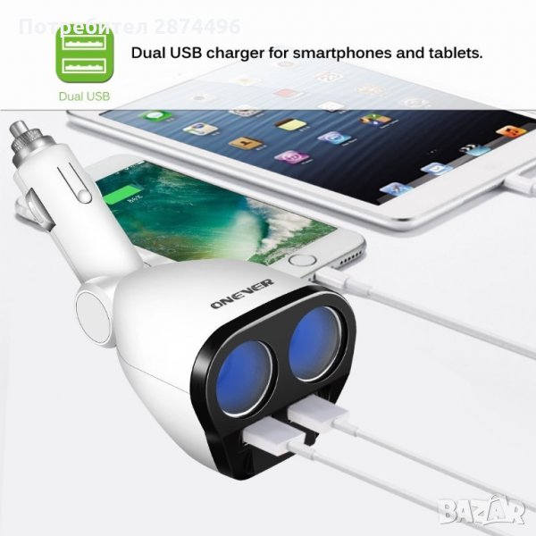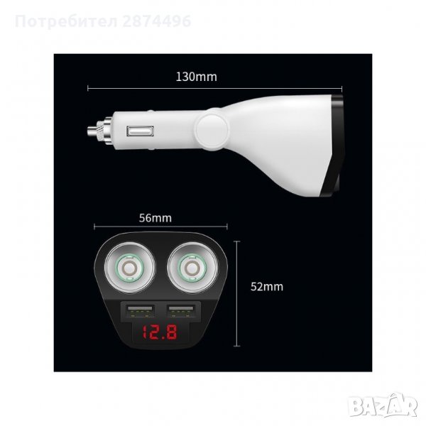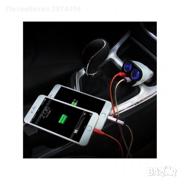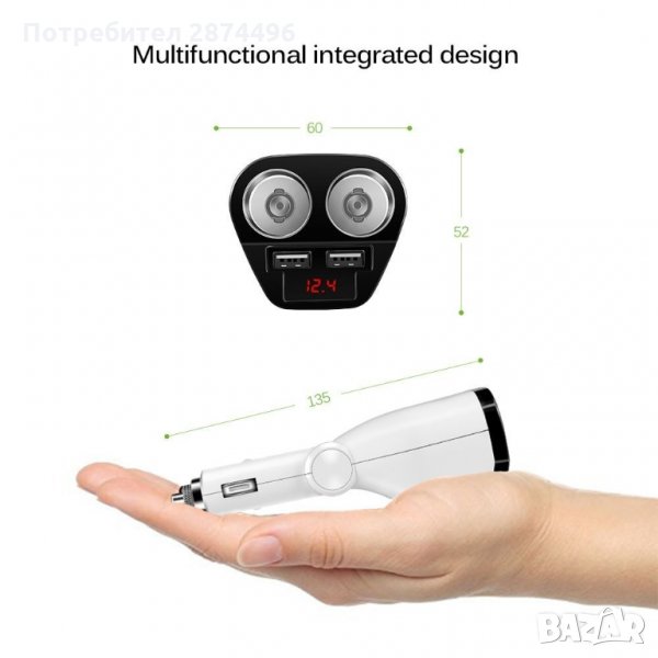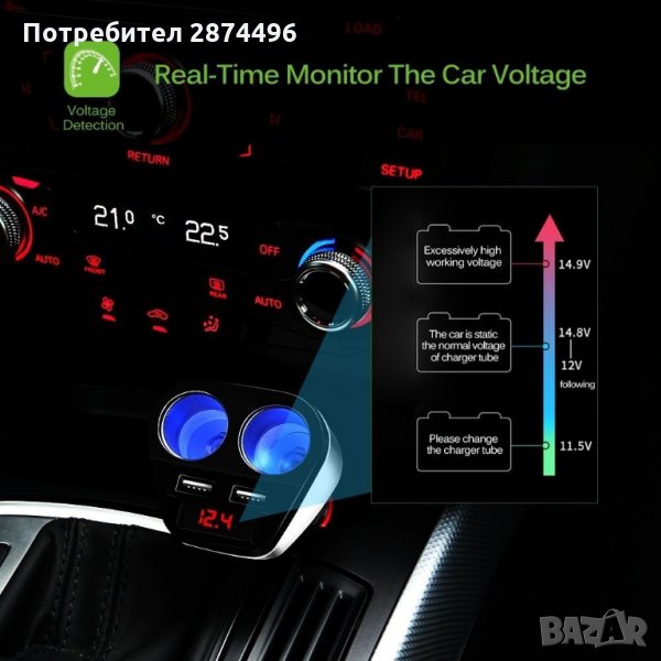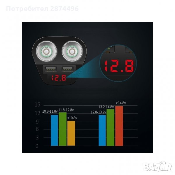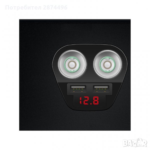 Разклонител за запалка в кола с две гнезда, с който може да наблюдавате напрежението на акумулатора в колата и едновременно да зареждате до две USB устройства.