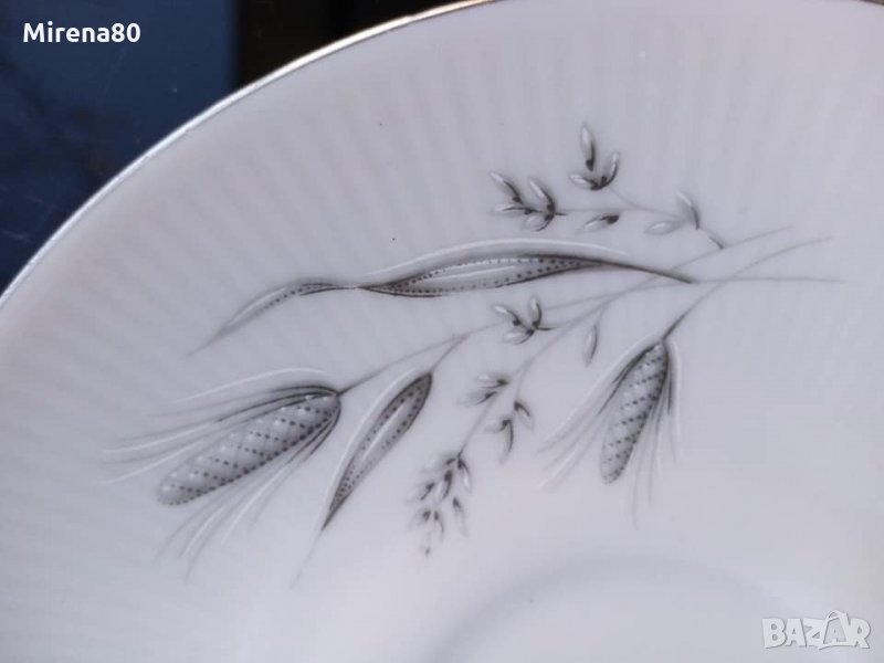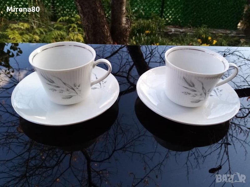 Сиво-черна декорация върху искрящо бял костен порцелан, завършен с платинено сребрист кант. Чашите са много красиви, елегантни, леки и прозирни...Едната има съвсем леко прекъснат кант от вътрешната страна - тя е на цена 6 лв. Другият сет - 8 лв. Маркирани за произход.