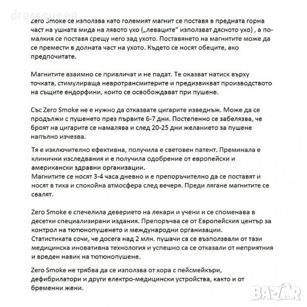 Предлагаме ви иновативна технология за подтискането желанието за пушене. Вече с подробни инструкции на Български. Zero Smoke представлява терапевтична акупресура на ухото. Тя спомага за освобождаването на същите ендорфини, които се произвеждат при пушене. Подарете си системата за отказване на цигарите Zero Smoke и променете своето ежедневие веднъж завинаги.