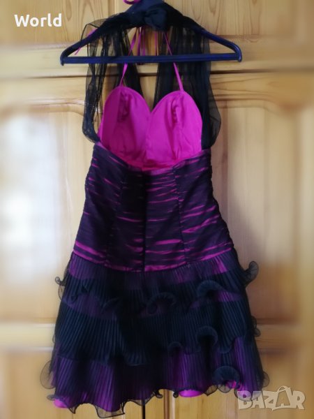 Дамска рокля в розов основен цвят и черен тюл отгоре, с твърди чашки. Обличана ВЕДНЪЖ по повод. Размери: дължина - 90см., ширина (измерена под бюста) - 72см.