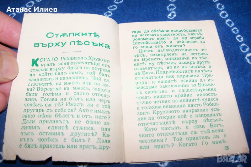 Изключително рядка миниатюрна книжка издадена през 1939г. от Ст. Стефанов. Заглавие "Стъпките върху пясъка", автор Рансъм Купър - Ransome W. Cooper. Книгата е с християнска тематика, 32 страници с меки корици и е в много добро състояние. Радмери 10,5 х 7,5 см. Книжката не е налична в нито една от библиотеките в България.
