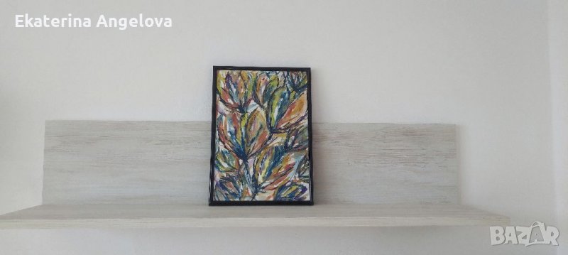 1. Абстрактна разноцветна картина wall art с лалета, цветя, жълто, синьо, черно, оранжево, лилаво, подходяща за дома и офиса, 22 X 30 cm - 50лв.