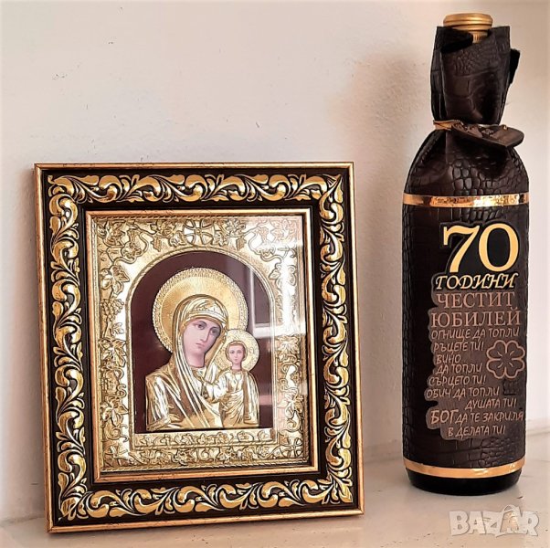 Настолна, златна икона Богородица с Младенеца с ефектна рамка и стъкло в допълнение с бутилка с цифри 50 и оригинално пожелание.