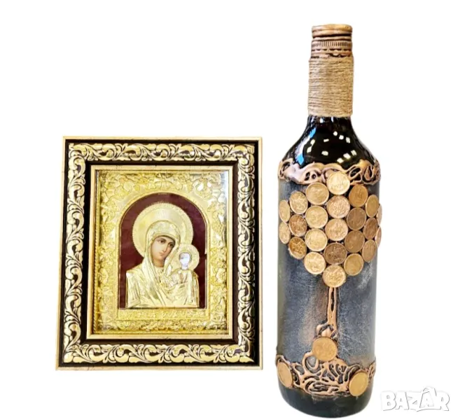 Красива, настолна икона със златен цвят, който не се променя с бутилка, която може да се ползва и в последствие след първоначалната й консумация.