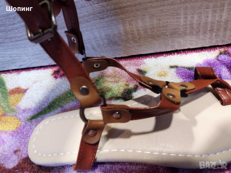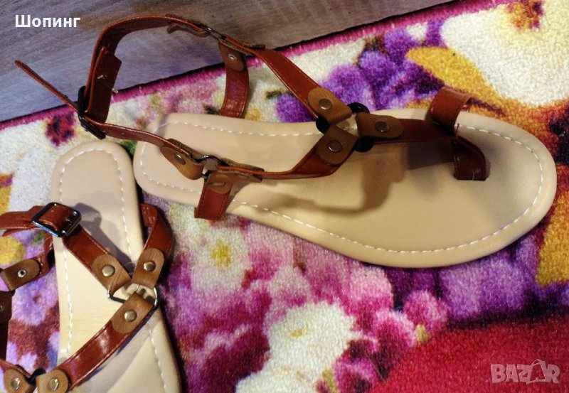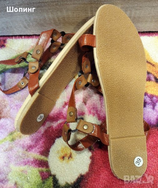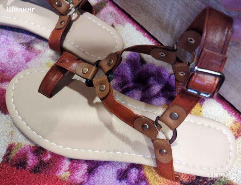 Нови! Ниски сандали с кафяви каишки и кожени орнаменти, номер 39 - стелка дължина 25 см.