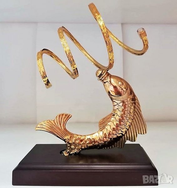 Златна риба - поставка за битилки от месинг и махагон самостоятелно или с юбилейна бутилка с вино за 50, 60, 70 и 80 год. или с бутилка Дървото на живота