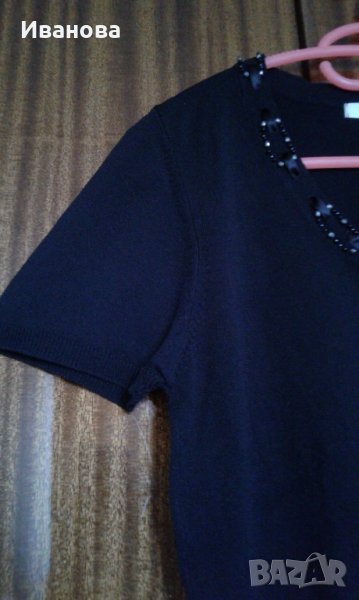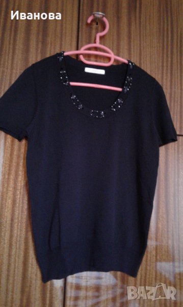 Черна блузка с къс ръкав от еластична материя с красиво деколте. Обличана 1 път. Размер по английска номерация 10.