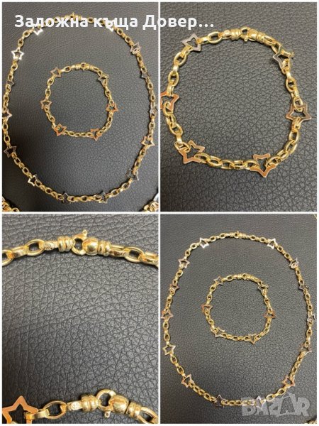 ПРОДАДЕН 4. Дамски ланец колие ланче “звездички” комплект с гривна.Изработени от бяло и жълто злато 14 карата 585 проба.Чисто нови!