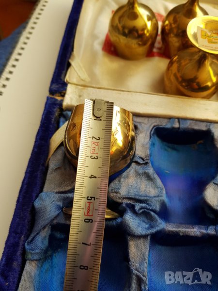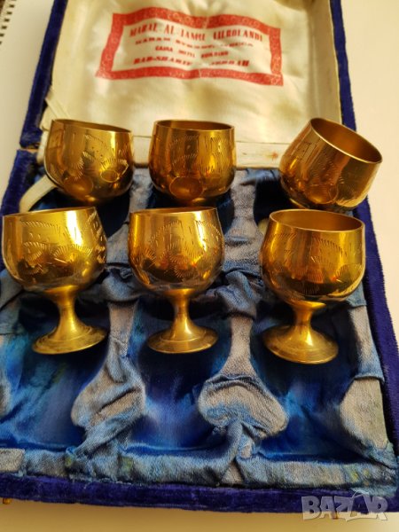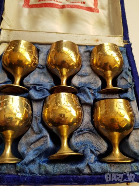Стар комплект от шест месингови бокала с кадифена кутия за съхранение.