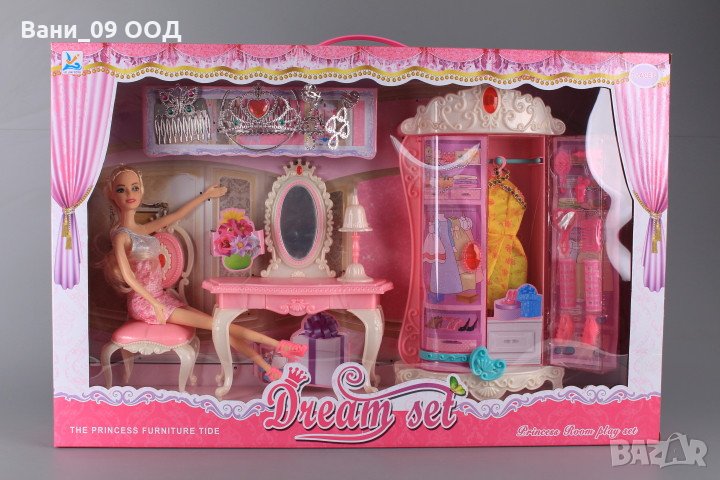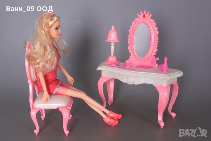 Комплектът съдържа кукла с чупещи се крака, тоалетна масичка с огледало, абажур, стол, гардероб, допълнителни рокля и обувки за куклата, гребенче, коронка, обеци и други аксесоари. Височина на куклата-30 см. Размери на гардероба-16*8*31 см. Размери на тоалетката-19*8*23 см. Размери на стола-8*8*18 см. Премахнете защитното фолио от огледалото! За деца над 3 години.