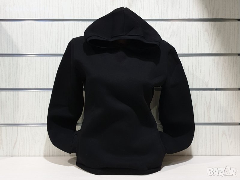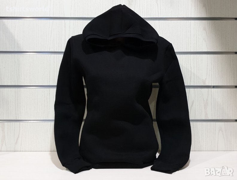 Страхотен нов дамски суичър в черен цвят с качулка и две джобчета. Произведен в България под марката PRINTEX от висококачествен 100% памук - триконечна пенирана вата с кардировка, което го прави изключително топъл и желан от нашите дългогодишни клиенти. Моделът е подходящ за пролетния и есенно-зимният сезон, има ластични маншети на китките и ханша, запазващи топлината. Разполага с мека подплата и два отворени джоба в страни. Свободната кройка го прави подходящ както за спорт, така и за ежедневно носене с дънкови панталони.