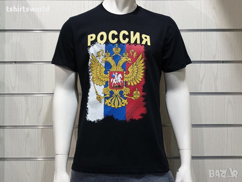 Страхотна нова мъжка тениска на руска тематика в черен цвят с дигитален печат Герба на Русия.