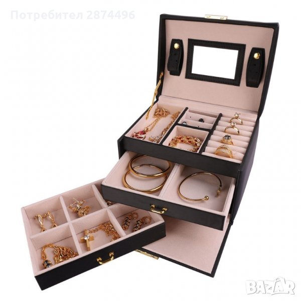 Кутията има допълнително чекмедже с удобни разделения, а капакът се заключва. След отваряне се разкрива много пространство за съхранение, както и огледалце на капака. Подходящ избор за съхраняване на часовници, гривни, пръстени, колиета и т.н.