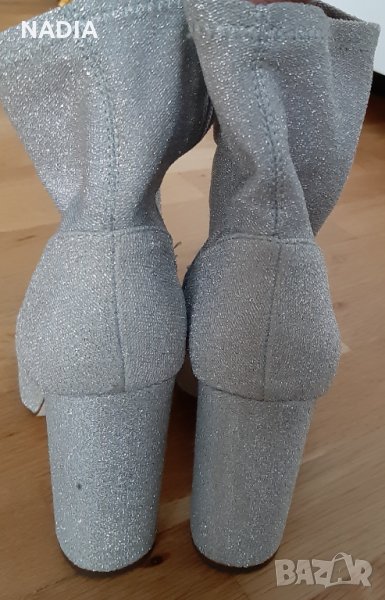Ботите са в отлично състояние, обувани са по някакви поводи. Токът е 9 см, материята е стреч с бляскави нишки.