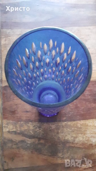 Масивна и тежка, гравирано стъкло синьо и прозрачно, височина 31 см, отвор горе диаметър ф 9,5 см, основа диаметър ф 8 см, чисто нова, без забележки