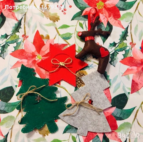 Коледна декорация, ръчно изработена от филц с декоративни елементи.