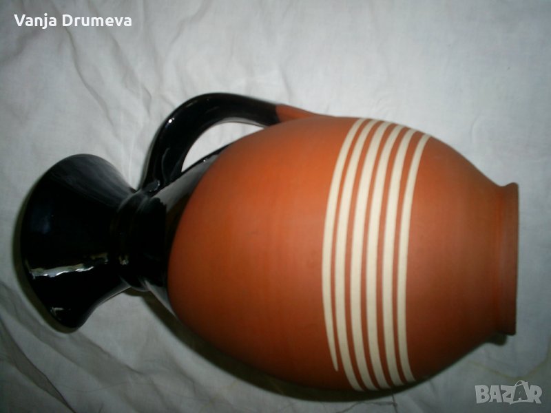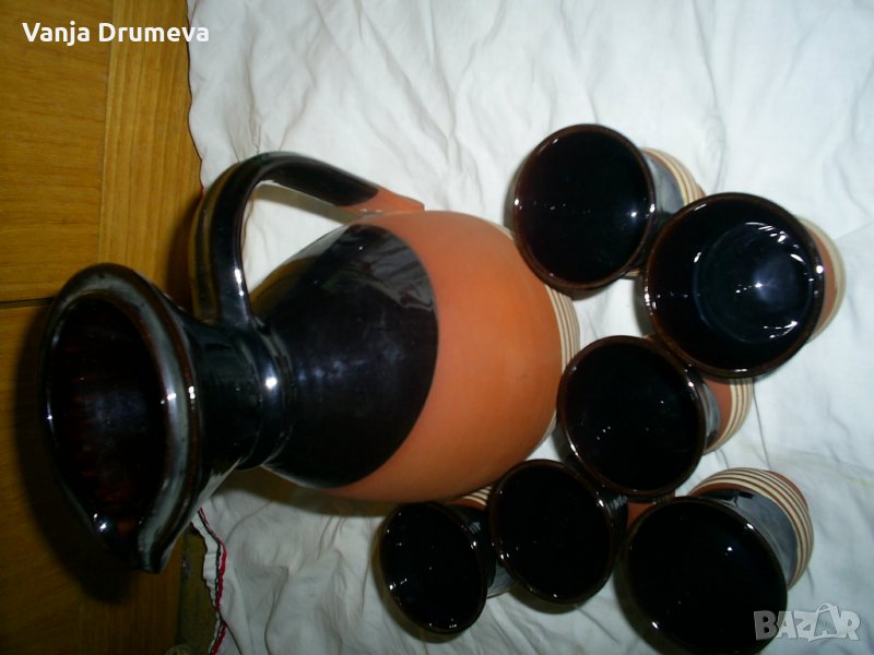 Сервизът е много красив и е подходящ и за подарък. Кана с височина 27 см,диаметър на отвора 10 см,,диаметър на дъното 7 см. Шест чаши с височина 9 см,,диаметър 6,5 см, диаметър на дъното 3,5 см.Няма забележки. Не е използван никога. Подходящ е и за механи,а може да се използва и за вино..