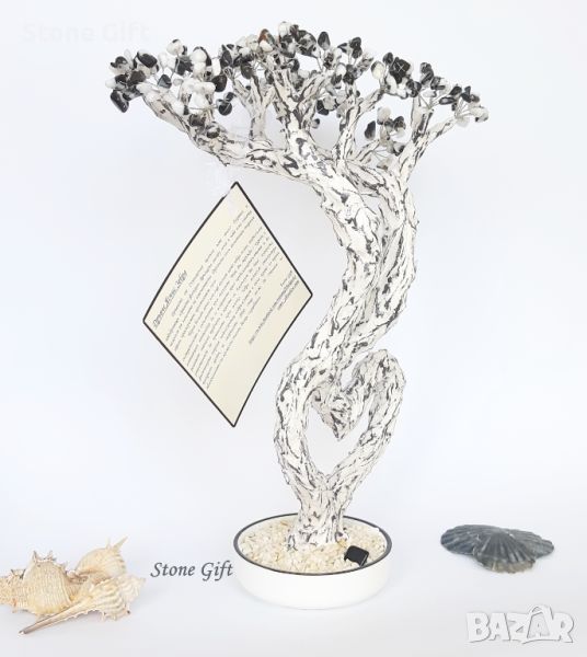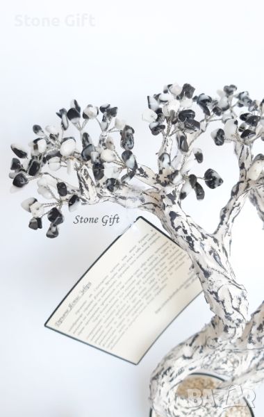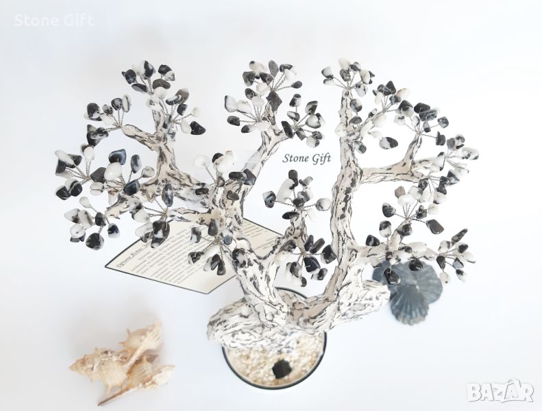 За това дръвче съм използвала Камъни от черно бял Яспис, медна тел, естествен гипс и речни камъни за основа. Дръвчето е високо 27 см., 15 см. широко и 15 см. дълбоко.