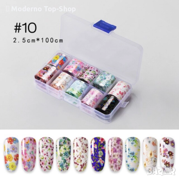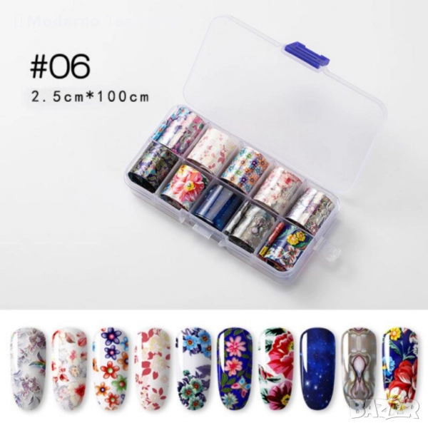 атрактивен маникюр. Фолиото е представено в различни ярки нюанси.