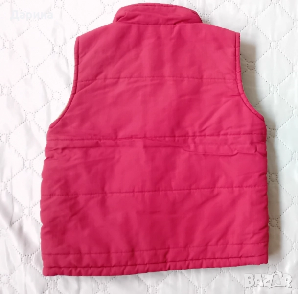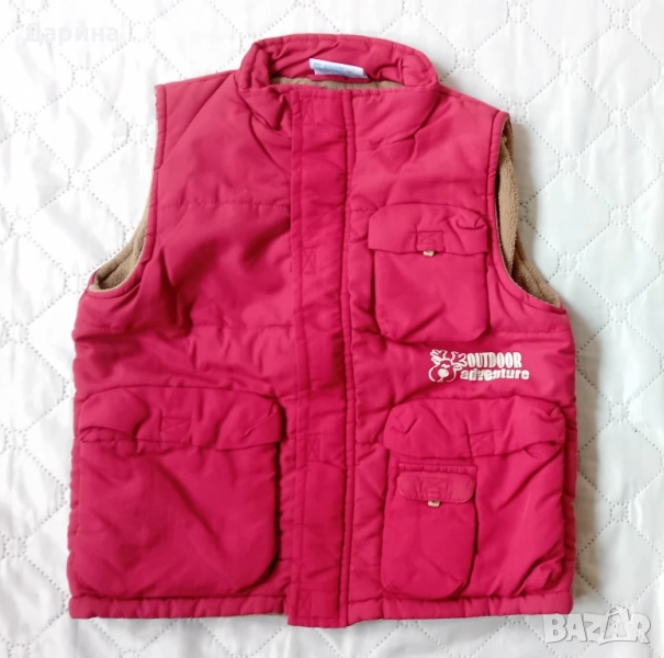 Ватиран елек за момченце . Размери в закопчано положение : Дължина : 45 см / Ширина в рамене едностранно : 27 см / Ширина под мишници едностранно : 38 см / Ширина в кръста едностранно : 38 см . Изпращам с Еконт за сметка на купувача .
