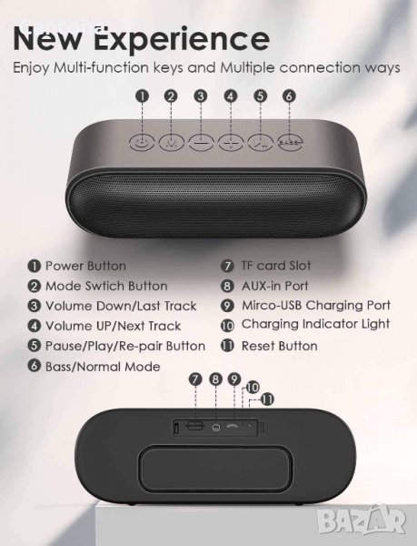 Advanced Bass + Technology: Натиснете бутона Bass + на водоустойчивия Bluetooth високоговорител, който ви помага да усетите реализма и интензивността на рок музиката или друга интензивна музика.Позволете на вашата музика да пее със стабилни ниски на всяка сила.
