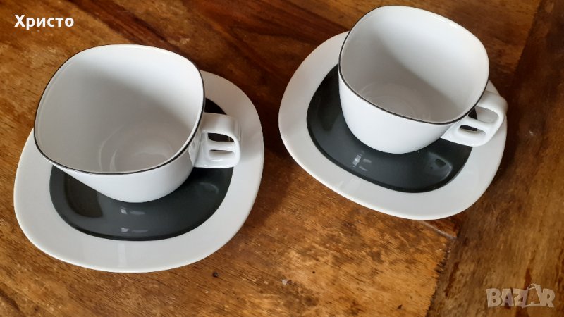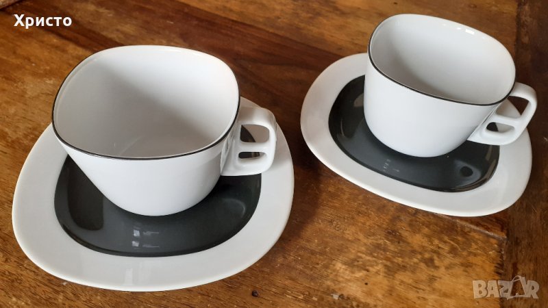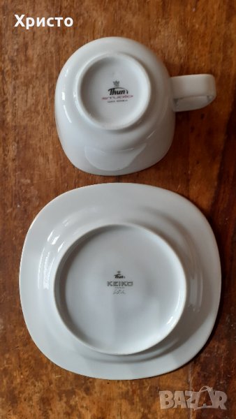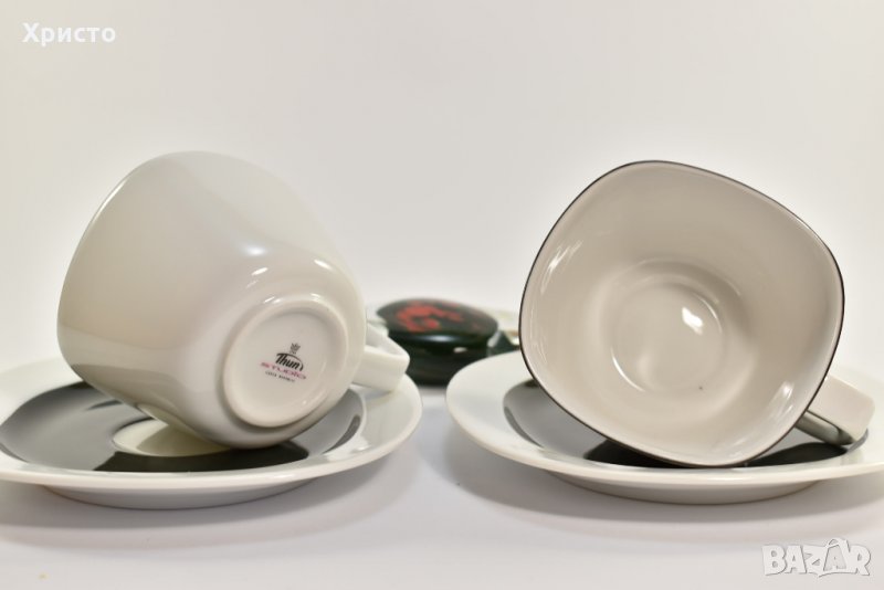 Чешки порцелан от завода THUN от 1794, Карловарски фин бежов порцелан, модел на Кейко Keiko, сервиз 6 чаши с чинийки, произведен през 1996 година, чисто нов, не е ползван нито един път, в оригиналната картонена кутия, без забележки. Чашата е висока 6,5 см, диагонал отвор 9,2 см, диаметър основа столче ф 4,2 см. Чинийка диагонал 16 см. Стилен, авангарден и изчистен дизайн, черен контур на ръба и черен цвят в чинийката, уникална дръжка, без позлатявания и рисунки, Уникален сервиз за ценители и за подарък.