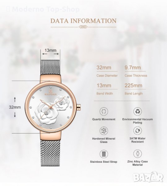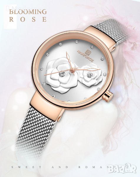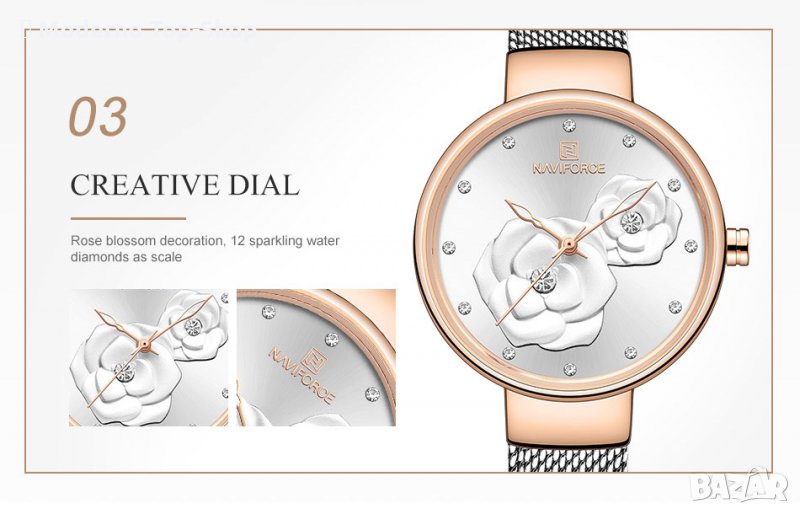 Страхотен модерен дамски часовник със свежа визия. Задвижва се от кварцов механизъм. Има корпус и каишка от специалната сплав на NAVIFORCE супер метал и стъкло от минерал-кристал. Водоустойчивост 3 АТМ.