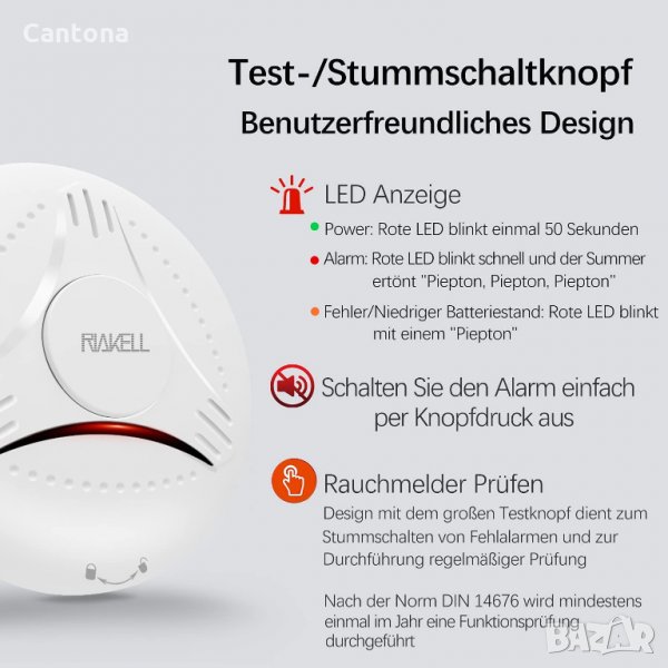 - Този пожароизвестител има функция за самотест. Детекторът за дим постоянно се следи и ви предупреждава навреме за неизправности и ниско ниво на батерията.