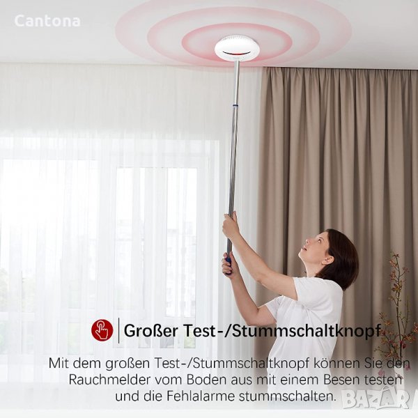 - Бутонът за тест/заглушаване е толкова голям, че детекторът за дим може да се управлява от земята без проблеми. Достатъчни са дръжка на метла или чадър, за да натиснете бутона за тестване. С бутона за тестване на функцията можете да тествате алармата редовно и просто да заглушите алармата, когато възникнат фалшиви аларми.