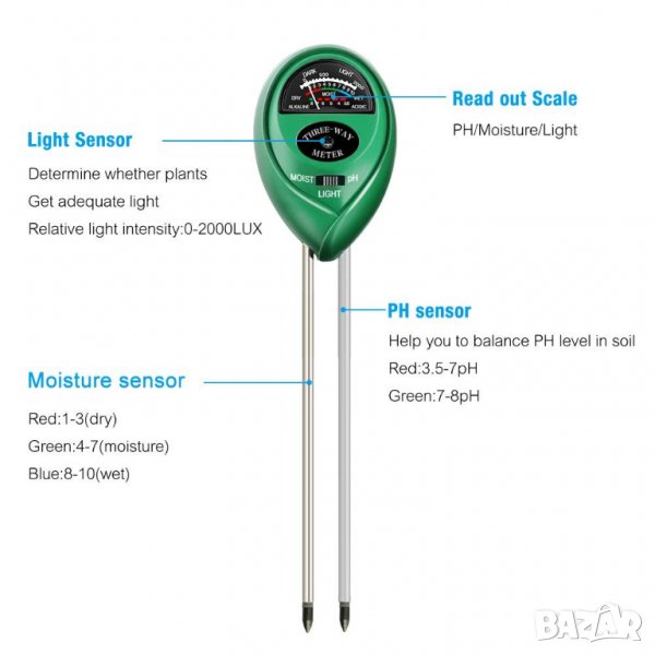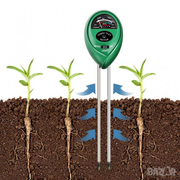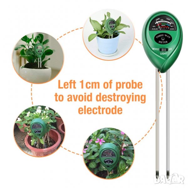 - Перфектен инструмент за тестване на почвените условия (влага/светлина/PH) на плодове, цветя, зеленчуци, храсти и др.