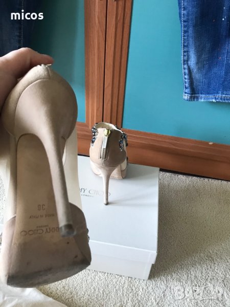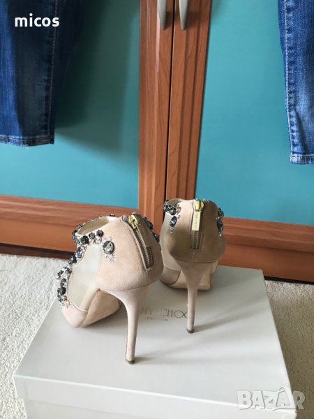 Jimmy Choo, оригинални!!!! обувани веднъж , естествен велур (изключително качество),цип-нежно златист, цвят на велура( пудра,телесен цвят),кристали Swarovski. Реална цена 1350евро!!!! 38 номер. Отвътре изцяло с мека и фина ест. кожа! Обявената цена е символична!