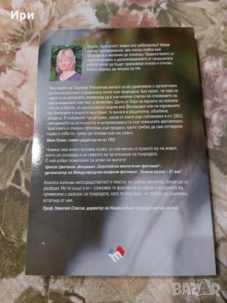 Текстовете на Павлина Михайлова винаги са ме удивлявали с органичната си безхитростност и искрена почит към природата. Бих казал, че това са черти и на авторката, посветила се в значителна степен на опазването на света възможно най-чист и естествен. Дали се бори за каузата на пойните птички в Малта, на растителните видове във Финландия или на изриването на боклуците в родната ни страна, тя винаги е решителна, обсебена, убедена. В събраните тук истории, някои от които съм публикувал в сп. GEO, най-ценното е истинността и непримиримостта към човешката арогантност. Тази книга е отворен прозорец към предели, които трябва да сме отгледали първо в себе си, преди да поемем към тях навън.