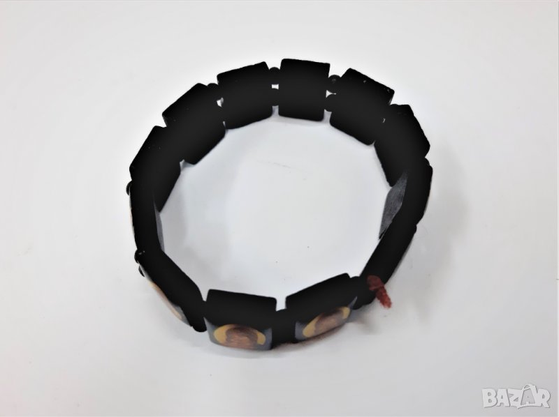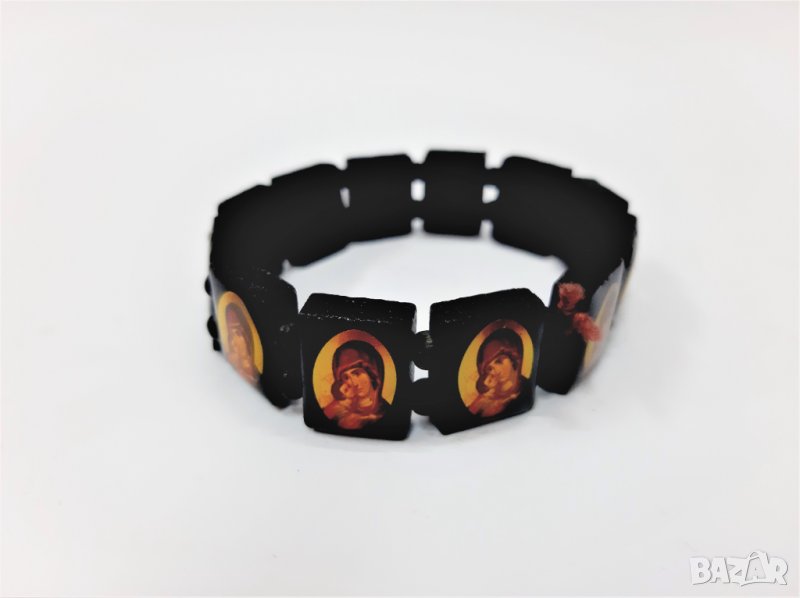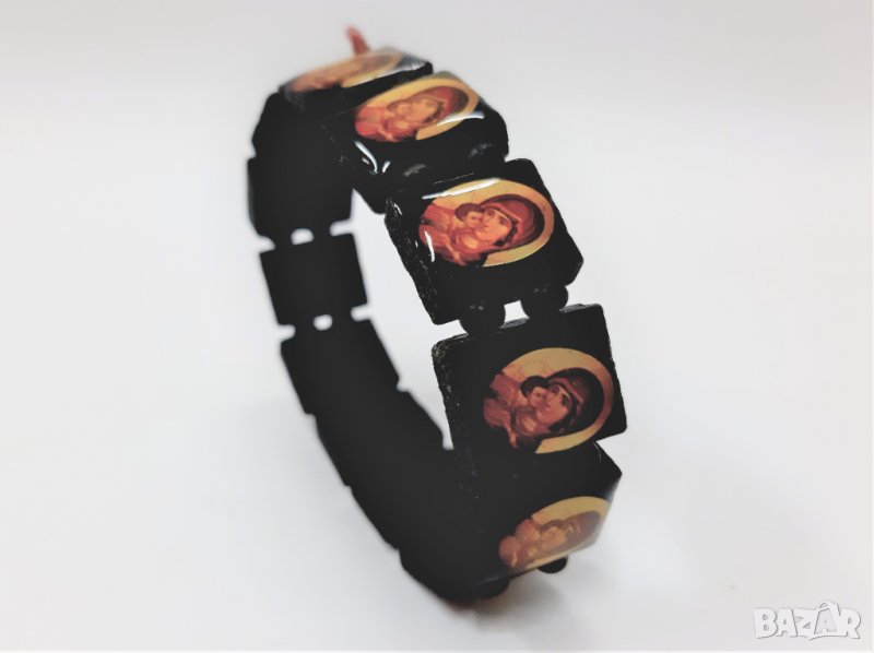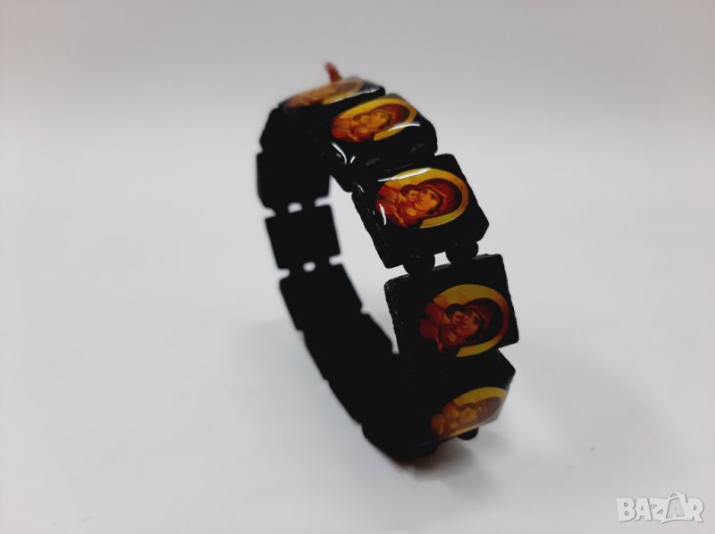 Тази красива черна дървена гривна с православни икони е изработена от фино дърво. Има няколко православни икони / светци, изобразени на всяка дървена плоча с дървени мъниста, разделящи всяка плоча.