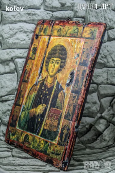 НОВА! Икона на свети ПАНТЕЛЕЙМОН с житийни сцени 30/22.5 см, уникат, декупаж