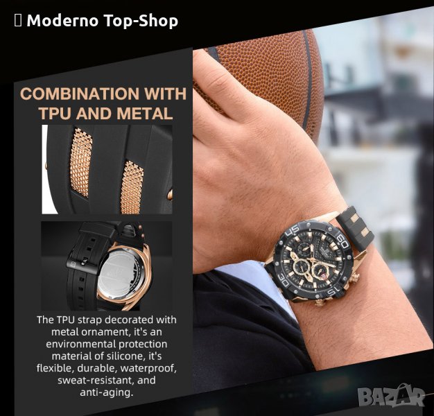 мъжки часовник с луксозна визия. Задвижва се от японски кварцов механизъм
