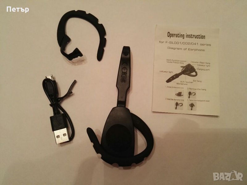 Комплектът съдържа 1 брой блутут слушалка, 2бр. държача за ухо, кабел за зареждане, инструкции за употреба.
